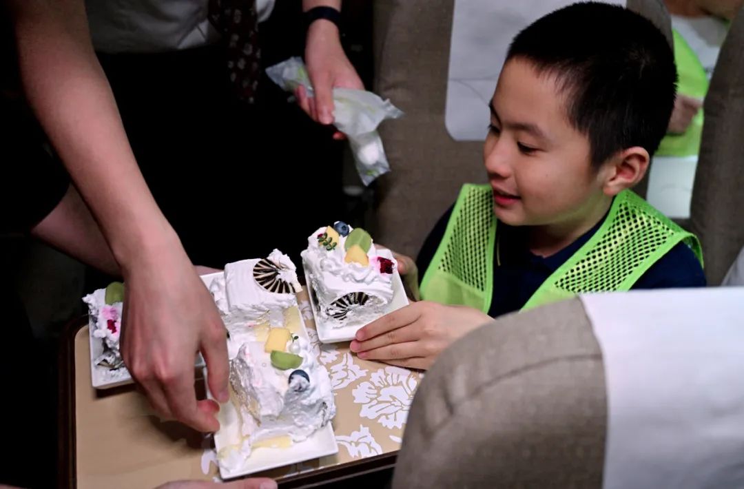 飞机上,精致的卡通糕点和儿童友好蛋糕让小小代言人们大快朵颐。