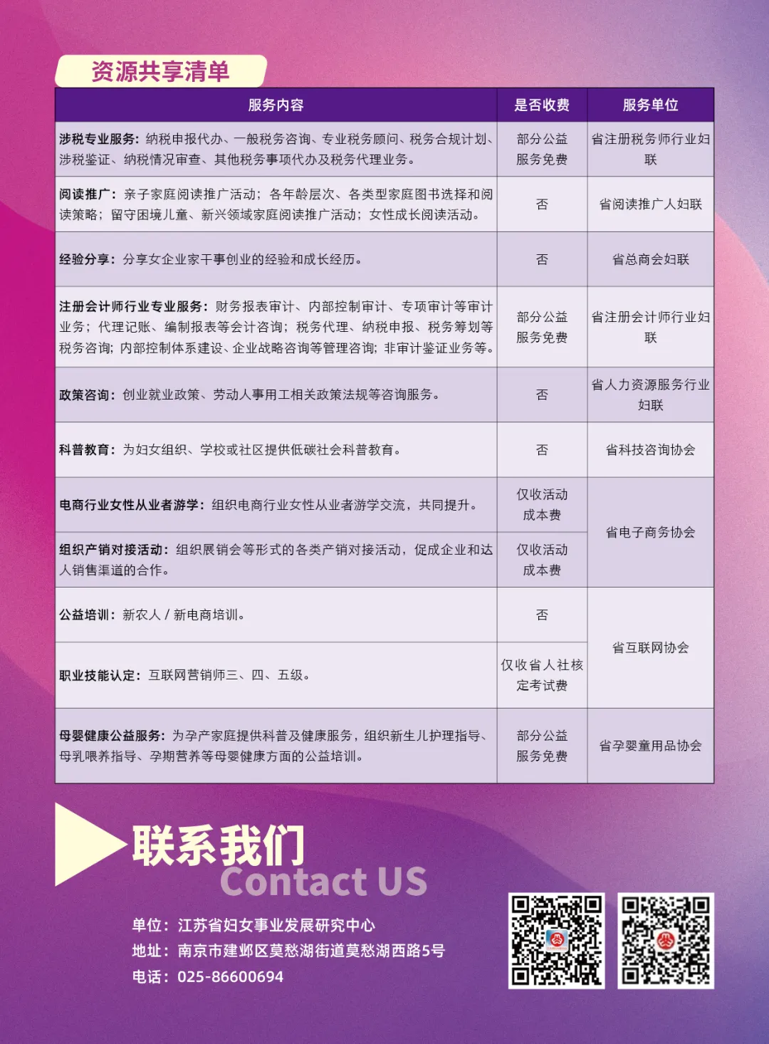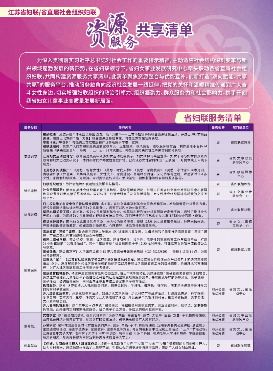为深入贯彻落实习近平总书记关于妇女事业和妇联工作的重要指示精神,认真落实全国妇联、省妇联关于进一步全面深化妇联改革的部署要求,主动适应社会结构深刻变革与新兴领域蓬勃发展的新形势,近日,在江苏省妇联的指导下,江苏省妇女事业发展研究中心牵头联动各省直属社会组织妇联,共同编制并发布《江苏省妇联/省直属社会组织妇联资源服务共享清单》(以下简称《清单》)。