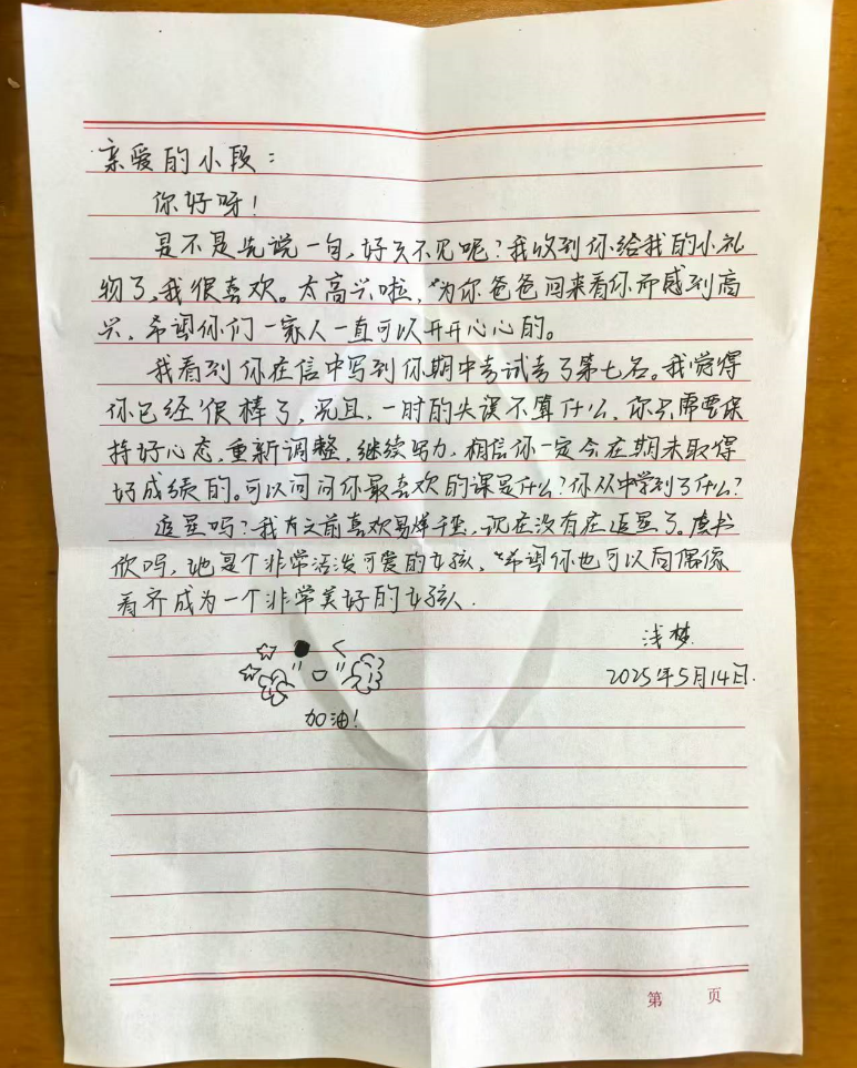 女孩小段因父亲常年在外打工,曾经总觉得“自己不如别人”,写信时常常流露出自卑。她的伙伴浅梦,在回信里没有讲大道理,而是分享自己幼时画画“把猫画成‘大脸怪’”被嘲笑,后来通过系统学习绘画找回自信的经历,还在信里“约好”:“我们一起努力,你好好学习,我好好画画,下次写信时,都要告诉对方一个进步的小事。”就这样,小段开始试着在信里记录自己的“小成就”:“今天我期中考试得了第七名”“我帮同桌修好了铅笔盒”“老师夸我扫地扫得干净”。每一次分享,都能收到浅梦充满鼓励的回信——有时是一个画在信纸上的加油手势,有时是一句“你超棒,继续加油”。如今的小段,不仅成绩稳步提升,还主动加入学校社团,课间总能看到她和同学们奔跑欢笑的身影。