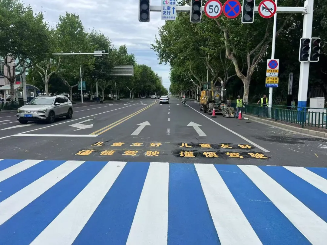 安全,是这条道路不可逾越的底线。溧阳市公安局从“儿童视角”出发,重构道路安全屏障:路段两端的斑马线一改黑白旧貌,换上蓝白相间的立体“新装”,鲜明的视觉冲击既提醒驾驶人提前减速,也引导孩子们注意通行安全;斑马线前的路面上,“儿童友好,谨慎驾驶”的暖黄色标语格外醒目;交叉口的路灯杆上,悬挂着“期待稳静 儿童友好”的引导提示……层层递进、细致入微的安全设计,为孩子们的每一次出行织就了一张坚实又温柔的守护网。