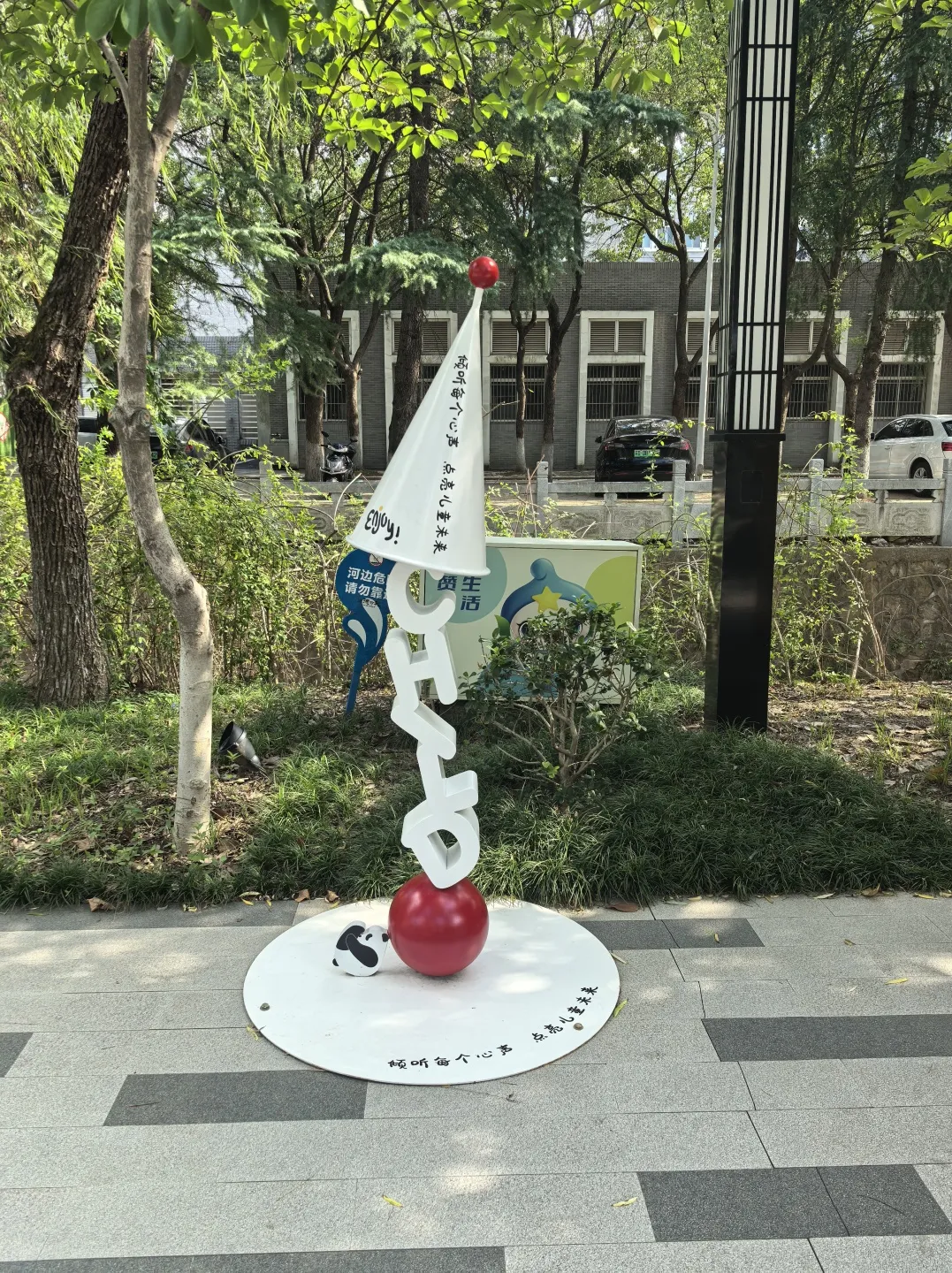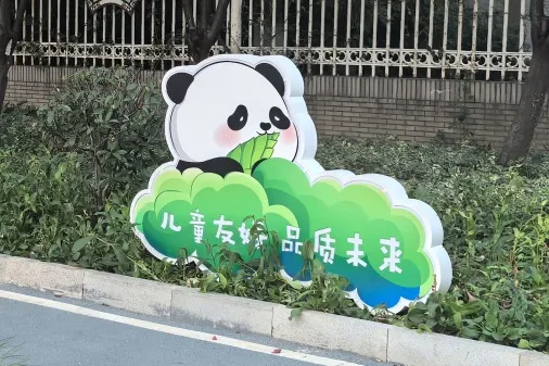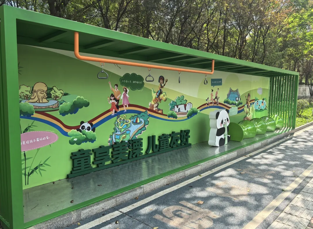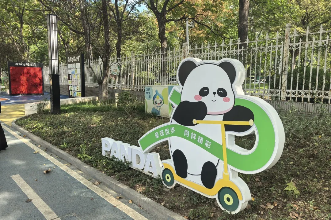 趣味,是这条道路跳动的灵魂。2024年新打造、占地约5360㎡的街角空间——“溧小青・拾光园”,不仅优化了原有的绿化与人行步道,更以橘、黄、蓝等明快色彩营造出浓浓的童趣氛围,休憩座椅、情绪解压装置、能量补给站等休闲娱乐设施散布其间,早已成为孩子们放学路上可玩耍、可停歇的“秘密基地”。今年,溧阳市城管局进一步在道路内侧绿化带增设多处互动打卡点,这些点位不仅巧妙融入常州儿童友好城市IP形象,更结合了溧阳的山水特色与科学家教理念。孩子们在互动留影、驻足休憩的同时,也能感受到地方文化与家风教育的无声浸润。沿路间隔布置的熊猫等卡通标语牌,憨态可掬地传递着“童享美‘溧’,儿童友好”理念,宛如一路相伴的童趣向导。