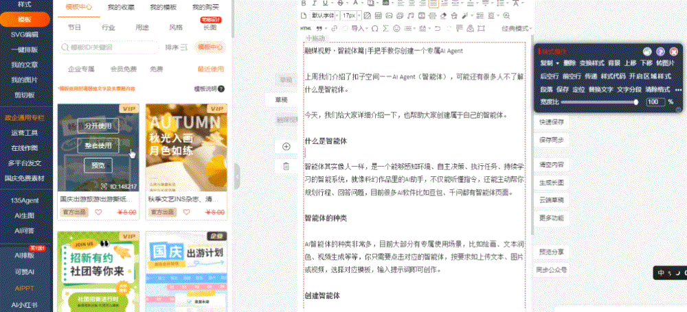 样式决定了你的文章呈现了什么风格,你可以点击模板—挑选模板—整套使用,从而统一风格,也可以对每个标题、章节内容、图片挑选对应样式,做到个性化编辑,编辑器会根据时间节点给出推荐样式,为我们节省了挑选时间。