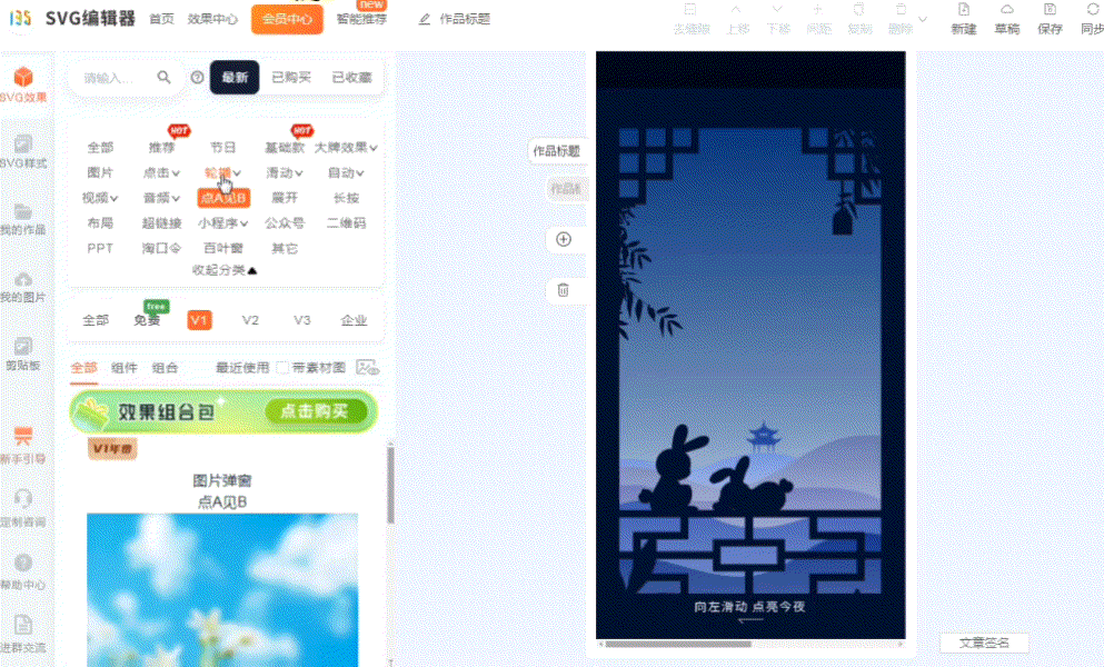 SVG编辑器比样式更进一步,可以让你的图文有互动效果,有很多可以选择,比如轮播图、点A见B、展开、长按等。