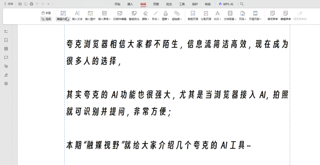 具体操作:PDF最麻烦的就是改字了,其实不必先转换成Word文档,你可以直接在文档里修改。点击上边栏的“编辑”,找到“编辑内容”。文档就会自动识别内容并给出改写方框,你就可以编辑文字了。改写的文字也可以调整大小、字体等,能尽量还原原文格式。