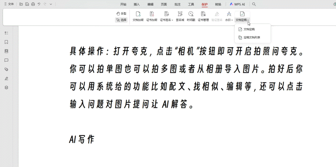 具体操作:PDF的文档保护也有很多形式,可以添加水印、将文档定稿,更深入的还可以给文档直接加密。你只需点击上边栏的“文档加密”,即可设置密码,部分功能如打印、注释、复制也可定向加密,确保文档安全。