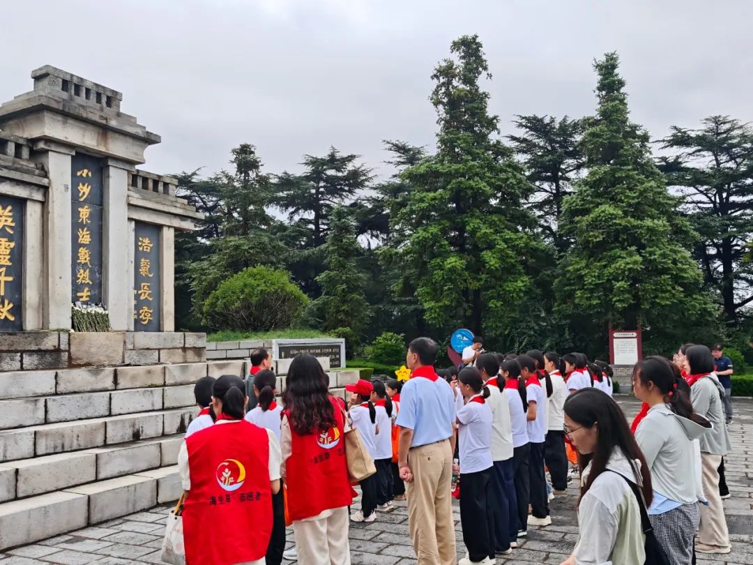 抗日山烈士纪念碑前松柏凝翠。从第一坡段的花岗岩广场出发,王爷爷指着远处的八角形大门:“这座大门始建于1941年,当时的抗日军民在战火中用碎石和木料搭建,每一块砖石都浸染着硝烟气息。”王爷爷与孩子们大手拉小手一同拾级而上,第三坡段的小沙东海战烈士冢赫然矗立,8.4米高的墓冢如同一艘永不沉没的战舰,三联碑上陈毅“浩气长存”的题词在晨光中泛着冷冽的光芒。“一鞠躬——”全体人员弯腰致敬,山风掠过松林,似在诉说对英烈的思念。