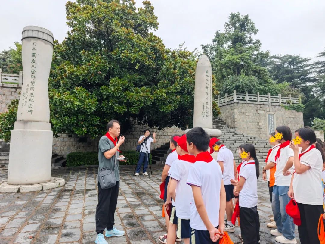 “1943年那场木船对铁艇的海战,16位烈士用生命守住海上通道。”王爷爷轻抚碑面,孩子们的指尖跟着游走在凹凸的铭文上。第四坡段的两座纪念碑吸引孩子们的注意。汉斯・希伯子弹头形纪念碑直指苍穹,罗荣桓题词“为国际主义奔走欧亚”仿佛仍在风中回响;而金野博纪念碑采用手榴弹造型,这位反战的日本士兵最终将生命留在中国战场。“不同的形状,同样的信仰。”王爷爷引导孩子们观察碑顶的和平鸽浮雕,他们若有所思地点头。当登上第八坡段,14米高的抗日烈士纪念塔映入眼帘。铸铁的八路军战士一手持枪一手擎旗,脚下的地球造型寓意着反法西斯战争的全球视野。“这座塔用了3000多块花岗岩,每一块都由战士们肩扛手抬运上山。”孩子们不觉轻触塔身的弹痕,感受历史的厚重与温度。