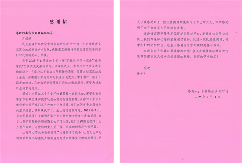 短暂相聚后,两家人借助通讯网络和交通物流,持续紧密联系,真正像石榴籽般紧紧抱在一起。春节时,帕尔如克大哥寄来新疆特产,周博则回赠南京“绿柳居”美食。古尔邦节,傅蕾一家送上节日问候。2024年9月,得知大米老师住院手术,傅蕾第一时间送上鲜花果篮。周博出差各地也不忘给新疆亲人寄纪念品。当周子傅备战中考时,维吾尔族姐姐的鼓励化作跨越时区的温暖。南京的傅蕾家庭与伊宁的米合热尼沙·吐呼地家庭建立跨地域亲情纽带,2025年暑假,米合热尼沙·吐呼地家的小女儿德丽如克·帕尔如克一人飞到南京,回到她南京的家过暑假,两家的孩子在暑期结伴研学,米合热尼沙特地给南京市妇联写来了一封真挚的感谢信。