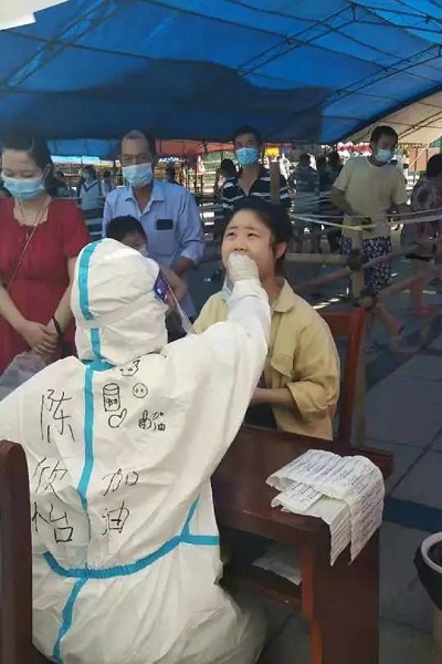 在芸台广场核酸检测采样点,1999年出生的陈集镇卫生院医生陈欣怡正在做进场前的准备工作,高温下,她穿着密不通风的防护服,十分憋闷,不到半个小时,就全身湿透了。长时间的弯坐采样,导致她一天下来腰都挺不起来。乐观的陈欣怡却毫不觉得辛苦,她说:“在最好的年华,做最有意义的事,‘90后’的我们有幸走上抗疫一线,是对我们最好的考验……”每次核酸检测采样,她都积极主动申请上一线,采样过程中更是冲锋在前。