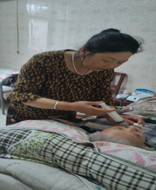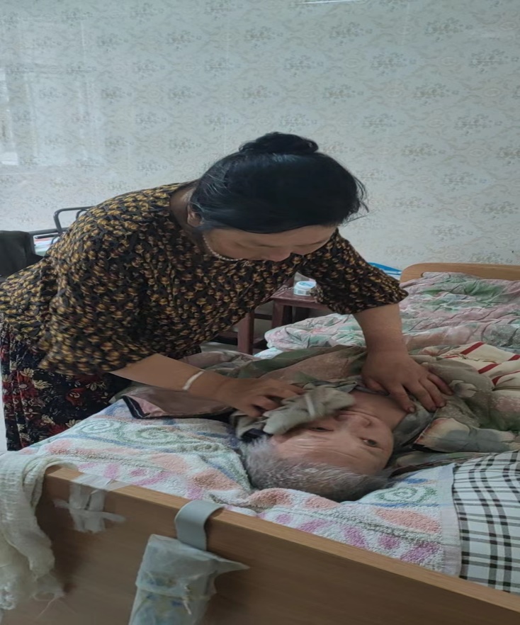 时至2018年下半年,婆婆病情渐渐严重,成了植物人,吃饭不知多少,大小便不能自理,于美云丢弃了手头一切事情,日夜守候在婆婆跟前,在这个不大的小屋里,处处显现着她对婆婆的关爱:干净的被褥,雪白的墙壁,房顶洁净的天花板……晚上婆婆一有动静,她就立即起来侍候,换尿布、翻身,几年来她没有睡过一个安稳觉。吃饭、喝水、喂药、洗脸、洗脚、换洗衣服、翻洗被褥、端屎倒尿……照顾婆婆的每一件事,她事必躬亲,每天变着花样给老人做饭,再用破壁机把各种食物打碎,一针管一针管地喂婆婆,每天傍晚还要为婆婆掏大便,她从没说过一句抱怨的话。因为婆婆常年卧病在床,为防老人肌肉萎缩,为老人买了气垫床,她还专门去学习了相关护理知识,一有空就给老人按摩,陪老人聊天解闷,耐心又细心。正是因为于美云的悉心照料,老人虽然体弱多病多年,身上却没有生过一次褥疮,屋里也没有一点异味,虽行动不便,精神状态却很不错。而于美云由于多年劳累,显得苍老了许多。