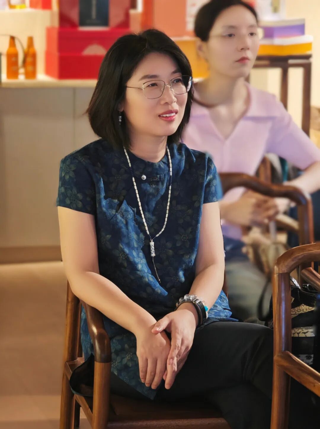 薛丽萍正与一位中年女性交谈